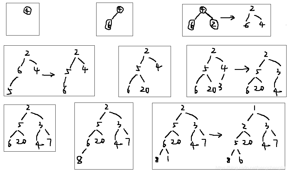 是输入一个之后,调整为小根堆。然后输入第二个,再调整为小根堆。。。这样得来的。整个过程如下图所示: