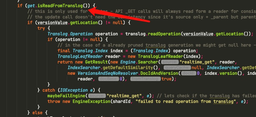 可以看到,当readFromTranslog为true时,get操作是从translog读取数据,而初始化的时候这个值和realtime取的是同一个值。也就是实时情况下(realtime=true),会从translog读取文档。这样就解决了前面抛出来的问题。