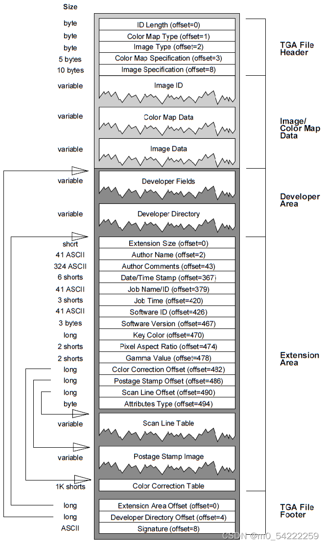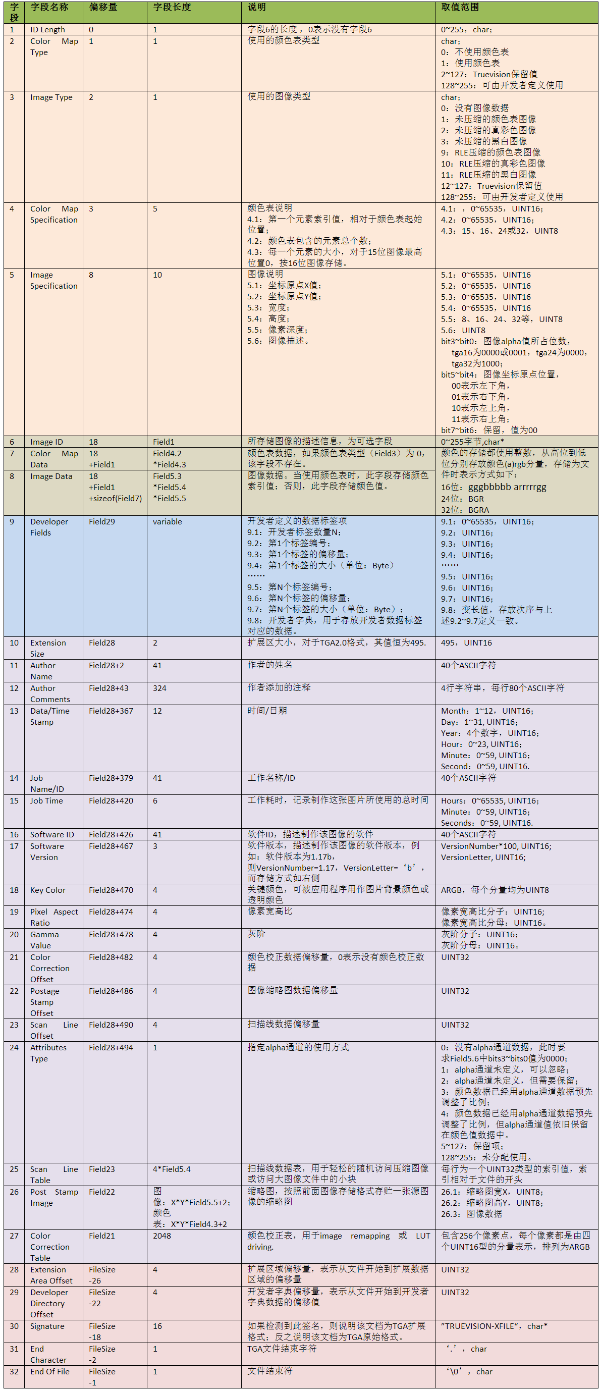 :由扩展区域偏移量,开发者目录偏移量和TGA文件扩展格式签名三部分组成,用于验证TGA文件扩展格式,并可以确定扩展区域和开发者字典的位置。