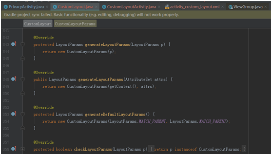 3、在重写的generateLayoutParams方法里调用CustomLayoutParams的构造方法