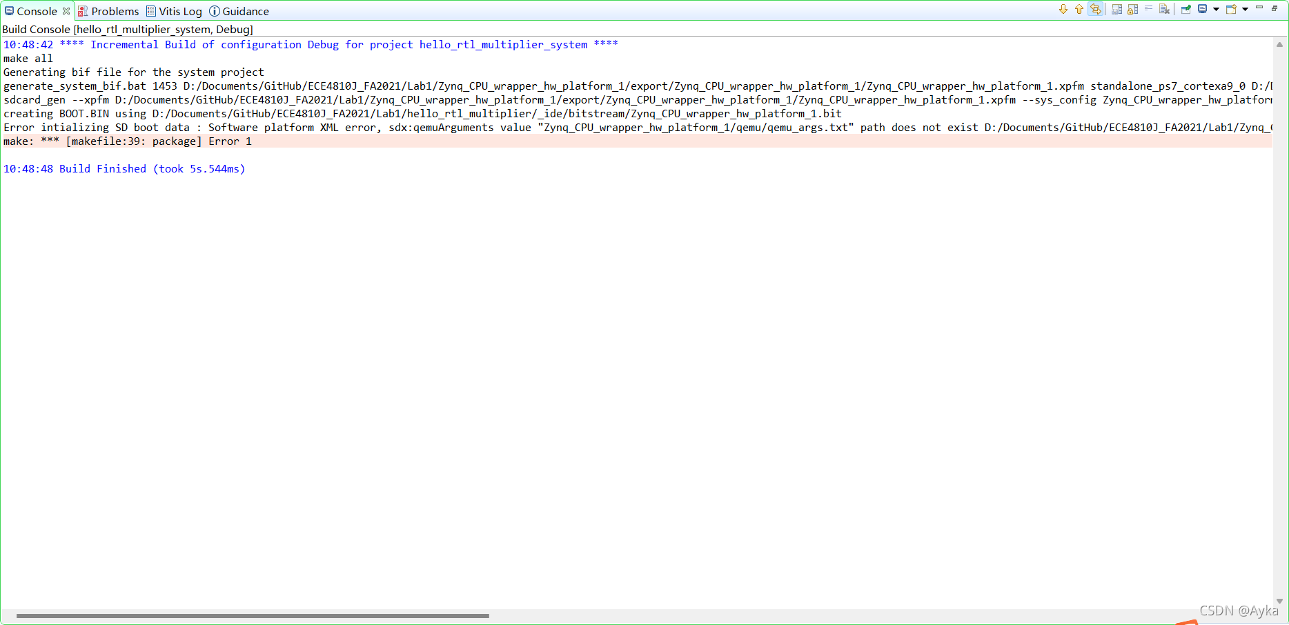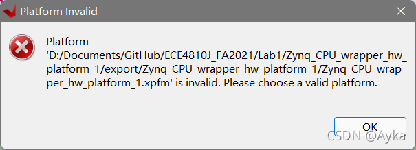 Error intializing SD boot data : Software platform XML error, sdx:qemuArguments value “Zynq_CPU_wrapper_hw_platform_1/qemu/qemu_args.txt” path does not exist D:/Documents/GitHub/ECE4810J_FA2021/Lab1/Zynq_CPU_wrapper_hw_platform_1/export/Zynq_CPU_wrapper_hw_platform_1/sw/Zynq_CPU_wrapper_hw_platform_1/qemu/qemu_args.txt, platform path D:/Documents/GitHub/ECE4810J_FA2021/Lab1/Zynq_CPU_wrapper_hw_platform_1/export/Zynq_CPU_wrapper_hw_platform_1, sdx:configuration Zynq_CPU_wrapper_hw_platform_1, sdx:image standard