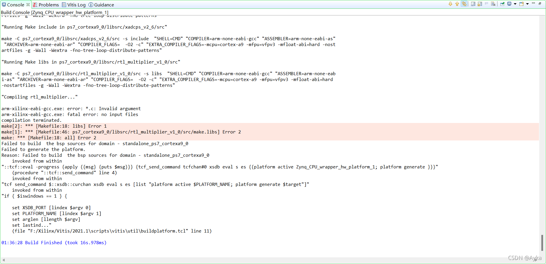 Find where this Makefile is through “make: Leaving directory” information. For me, it is located at Zynq_CPU_wrapper_hw_platform_1\zynq_fsbl\zynq_fsbl_bsp\ps7_cortexa9_0\libsrc\rtl_multiplier_v1_0\src\Makefile (we assume Zynq_CPU_wrapper_hw_platform_1 is the platform name and is under the Vitis workspace folder). Locate this file, we see the following code: