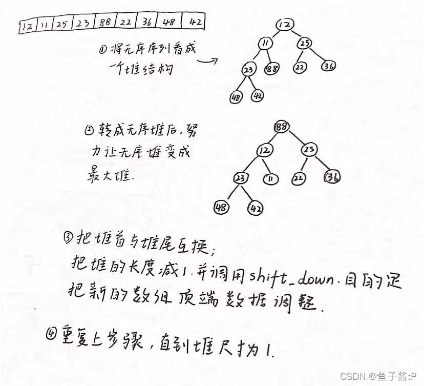 ① 将待排序的序列构造成一个最大堆,此时序列的最大值为根节点