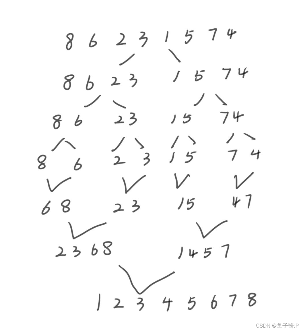 基本思想:将待排序元素分成大小大致相同的2个子集合,分别对2个子集合进行排序,最终将排好序的子集合合并成为所要求的排好序的集合。