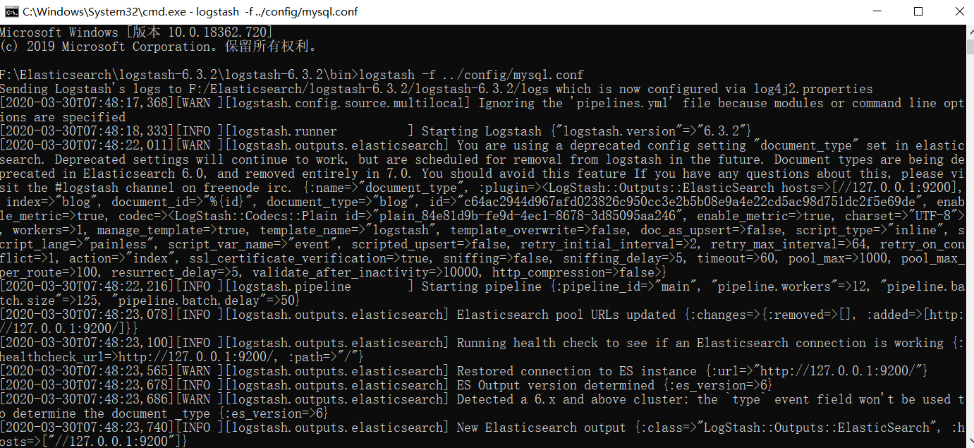 (1). 打开cmd输入logstash -f …/config/mysql.conf