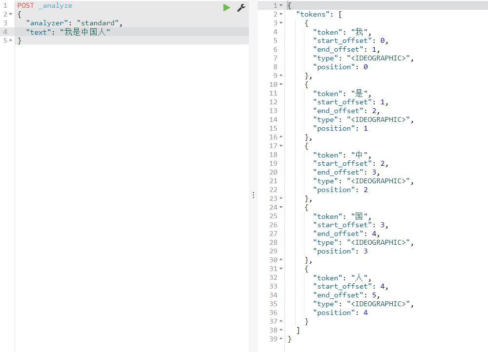 standard : ES默认分词器,将单词转换为小写,去除停用词与符号,支持中文——单字切分