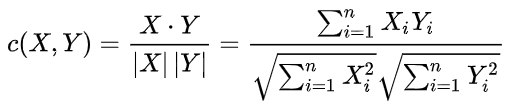 衡量向量相似度的一种方法。输出范围为-1到+1, 0代表无相关性,负值为负相关,正值为正相关。