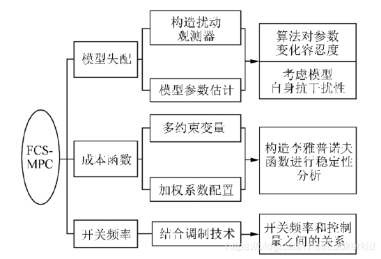 - FCS-MPC策略中电机参数变化会直接影响预测控制的性能,模型参数变化会导致模型失配。目前解决模型失配问题从构造扰动观测器、模型参数估计这两个方面展开,被动地减小参数变化带来的影响,没有具体分析MPC对参数变化的容忍度,也没有从模型自身的抗干扰性出发。对成本函数的研究主要集中在多约束变量和加权系数配置,对控制系统的稳定性分析却很少,原因是构造的成本函数大多不符合李雅普诺夫函数的定义。 FCS-MPC不需要调制单元,因此逆变器开关频率不固定、交流电压和电流的谐波频谱分散,限制了其实际应用。目前一般采用结合调制技术的思想和开关序列控制的思想,没有从根本上去分析 FCS-MPC开关频率与控制量之间的关系。