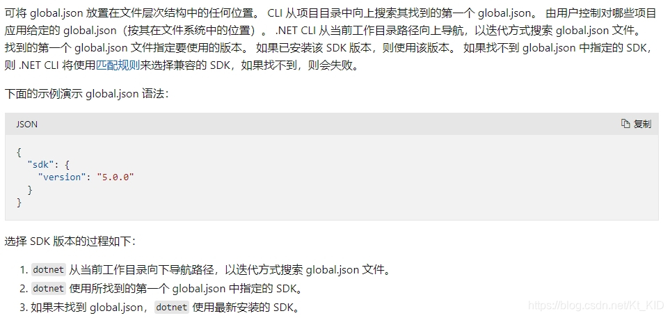 3、找一下MSDN关于这个文件的说明,很明显了,就是缺失global.json文件导致的,于是按照这个语法在工程根目录条件一个global.json文件即可,注意版本号要使用已安装的版本号。