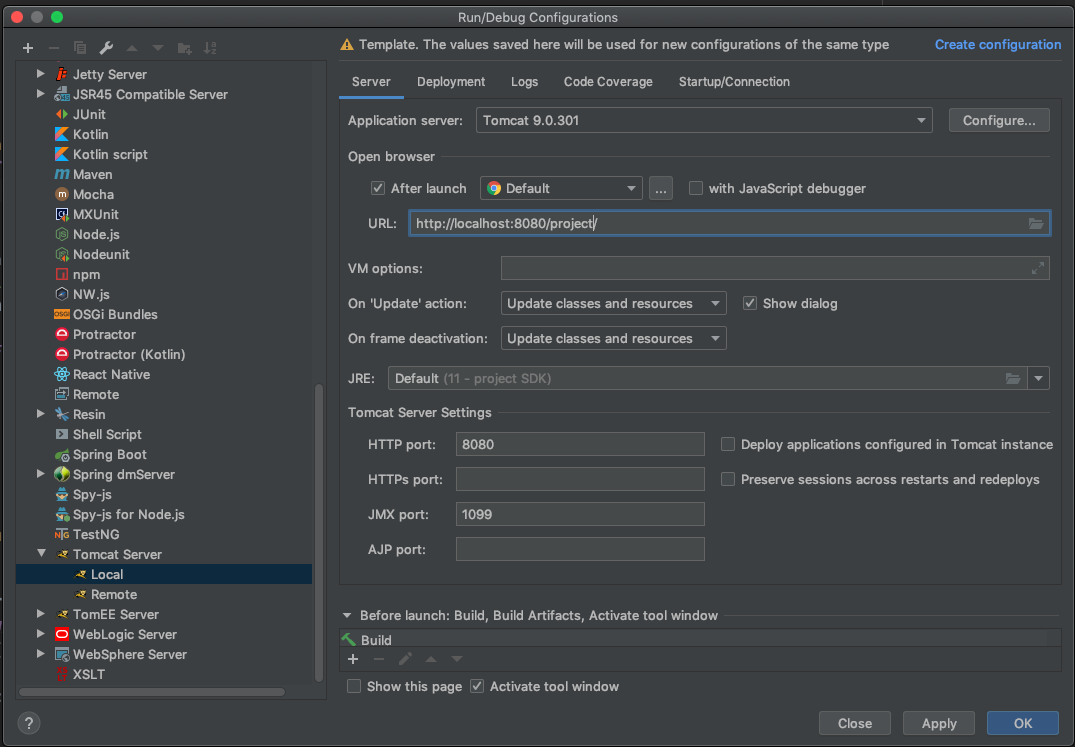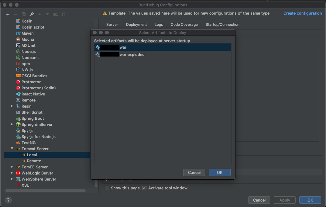 1、在IDEA工具栏中点击“Run/Edit Configuratons…”,在弹开的窗口中,找到Templates/Tomcat Server/Local。如下图所示:
