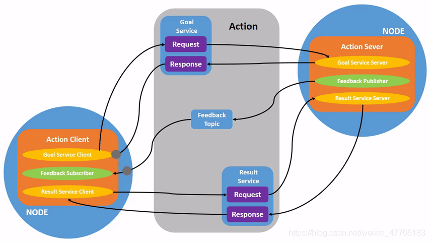 在客户端给出Goal Service Request后,服务器返回Response,而后客户端给出Result Service Request,服务器多次反馈后,再返回Response.