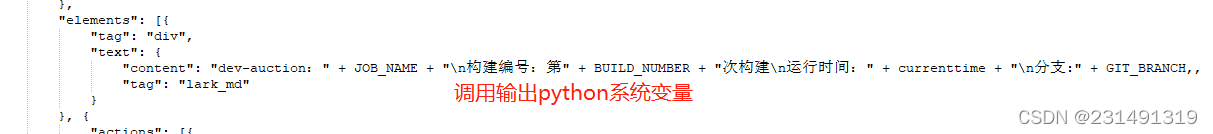 "content": "项目名称:" + JOB_NAME + "\n构建编号:第" + BUILD_NUMBER + "次构建\n运行时间:" + currenttime + "\n分支:" + GIT_BRANCH,
