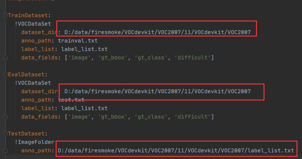 修改configs\datasets\voc.yml中的存放数据集的路径