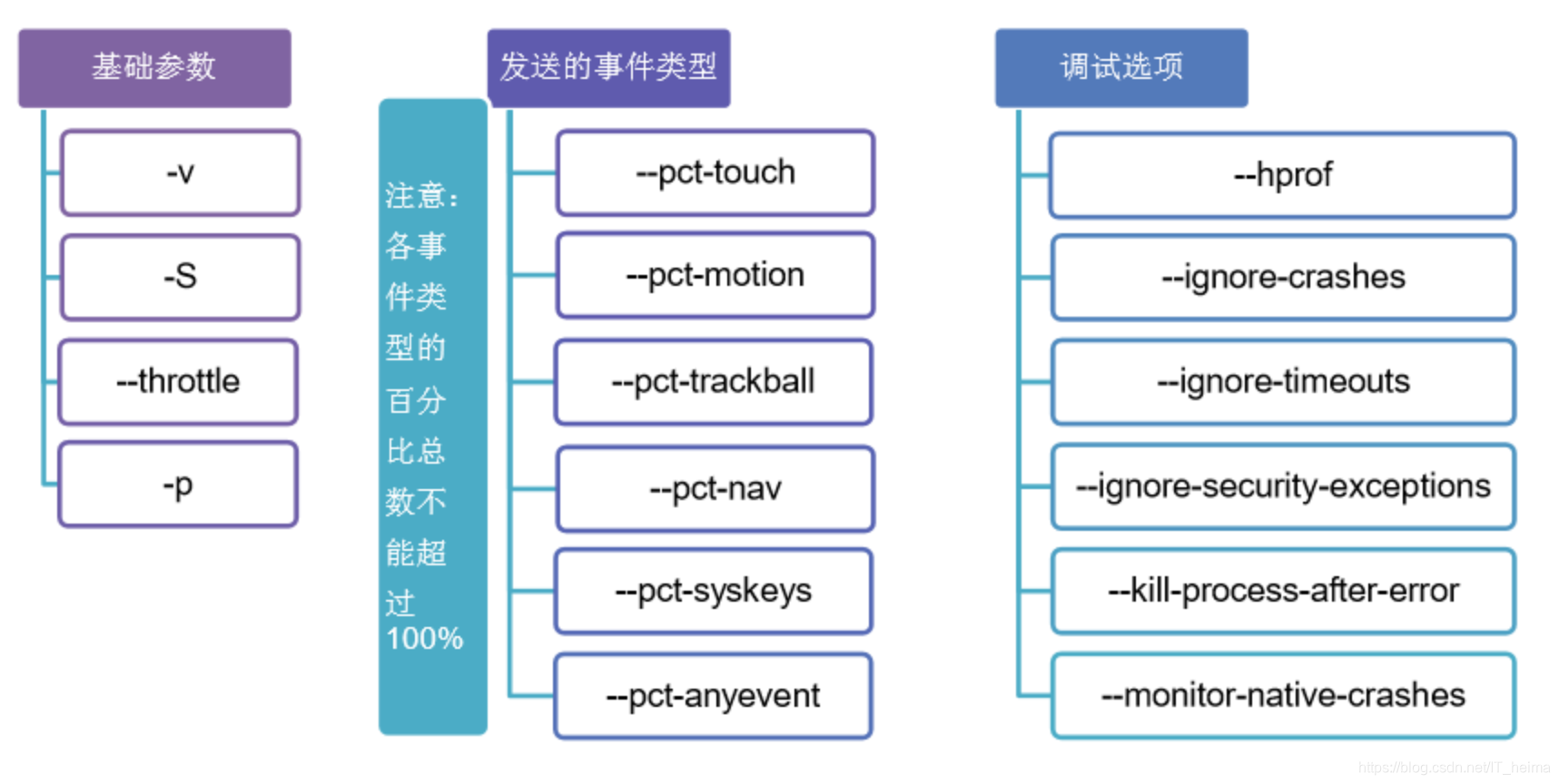 - 11:–pct-anyevent 其他事件类型,除前面提到的10种事件外其他所有的事件,如按键、其他不常用的设备上的按钮等。可通过–pct-anyevent参数来配置其事件百分比
