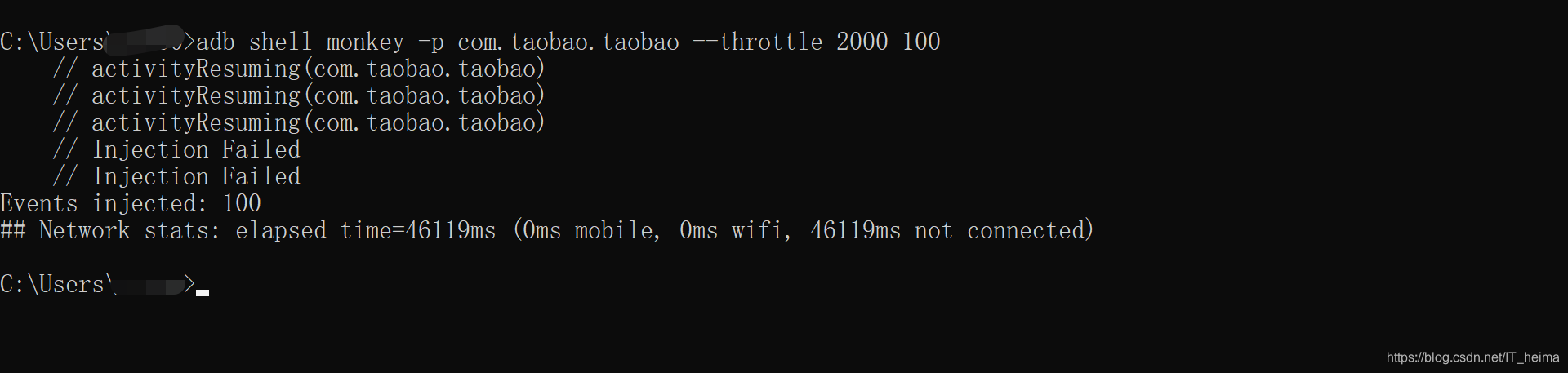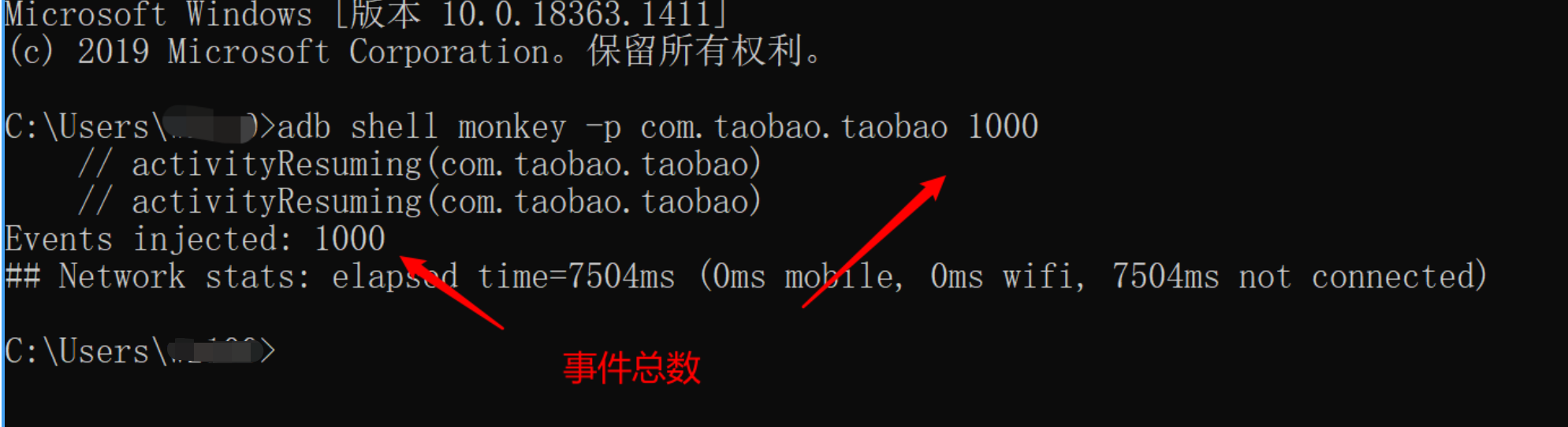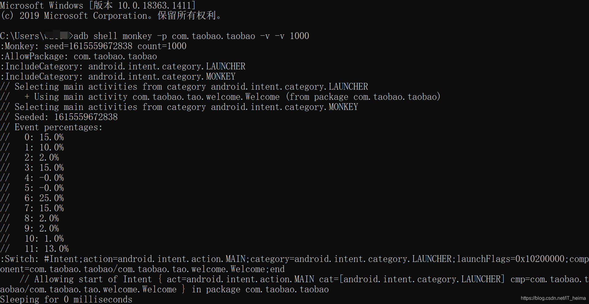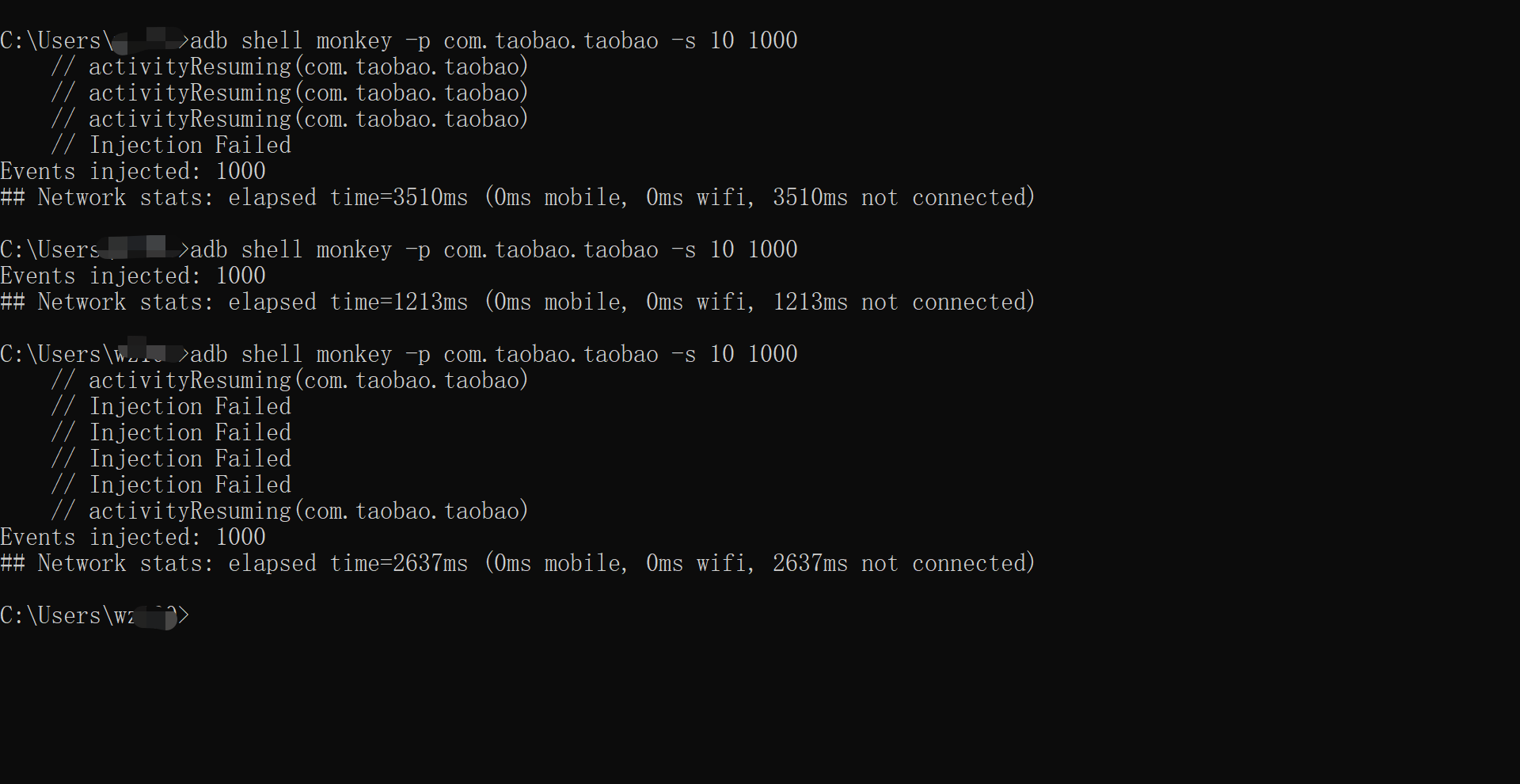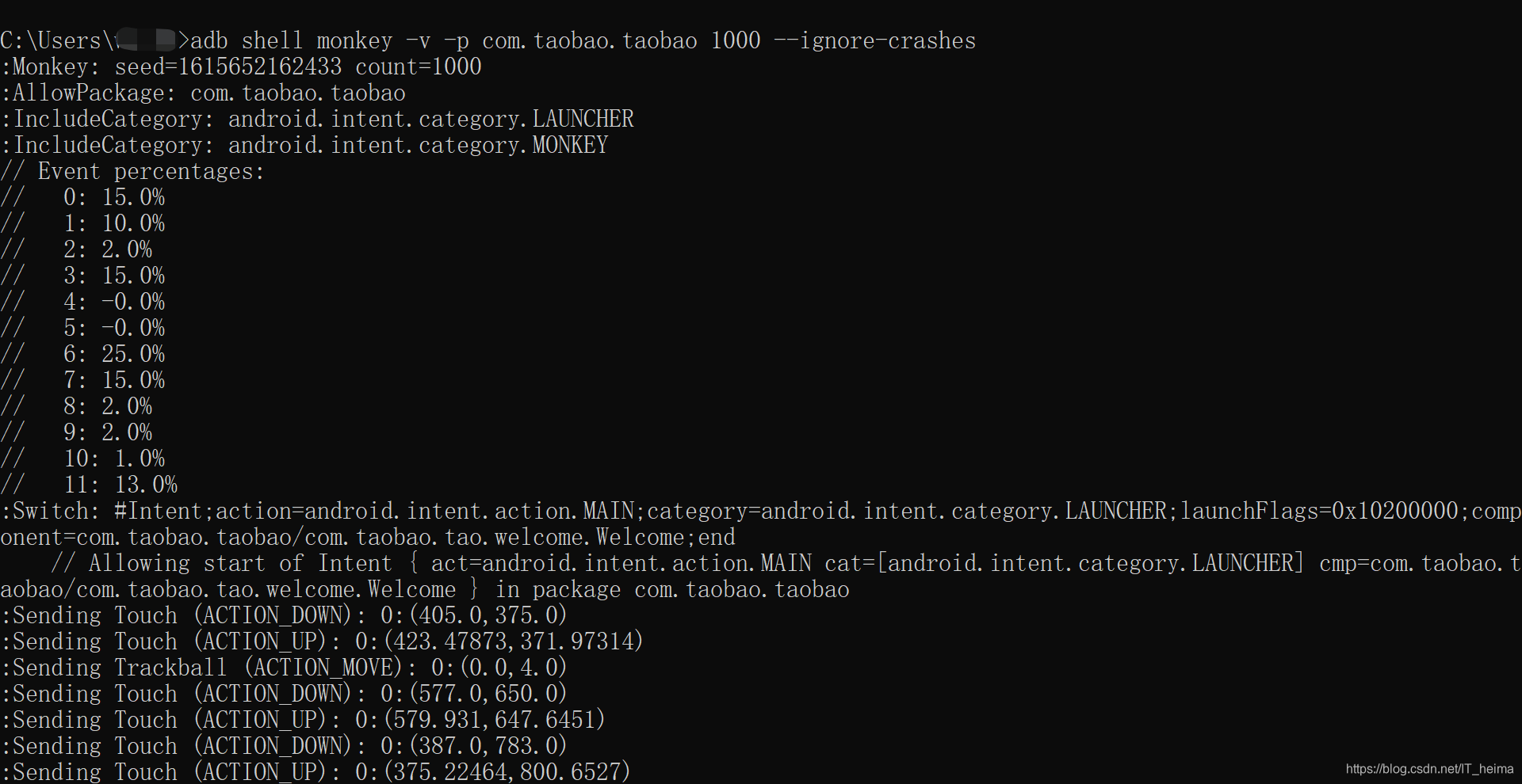 - 格式:adb shell monkey -p com.taobao.taobao 1000 :package的缩写,后面跟包名 1000 表示随机事件次数