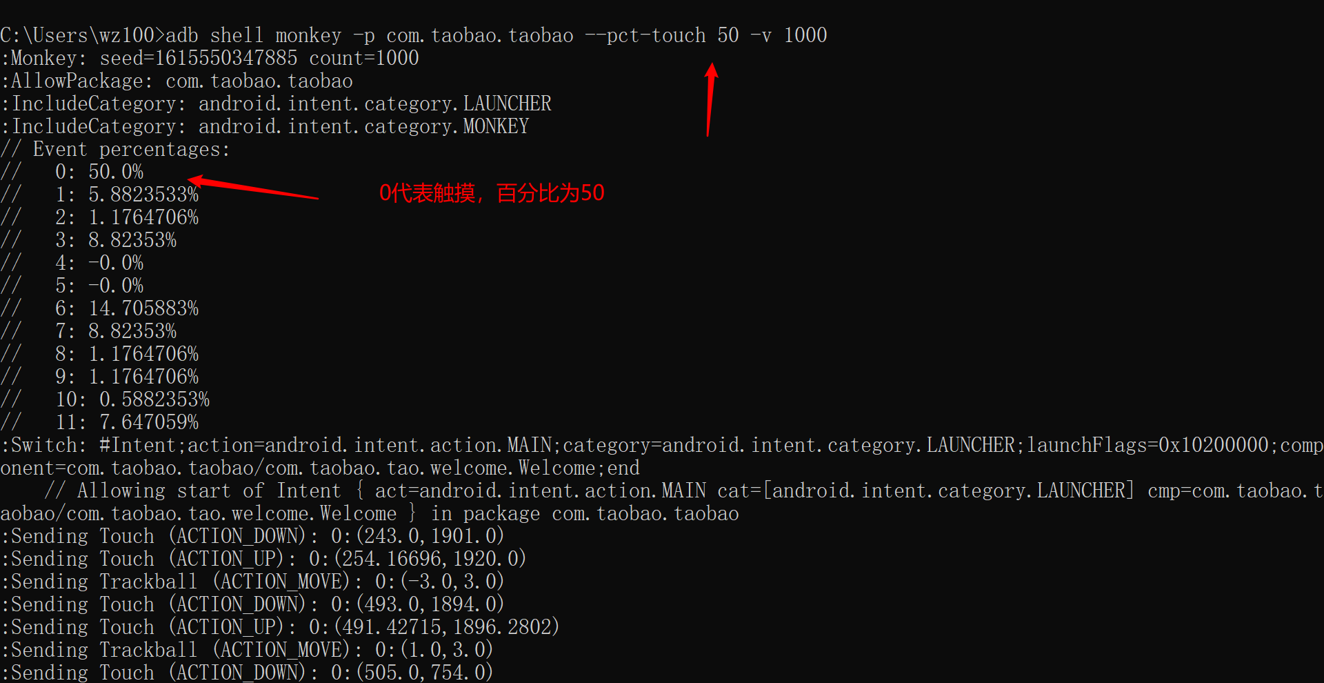 - adb shell monkey -p com.taobao.taobao –pct-touch 50 -v 1000 :指定touch事件占比50%