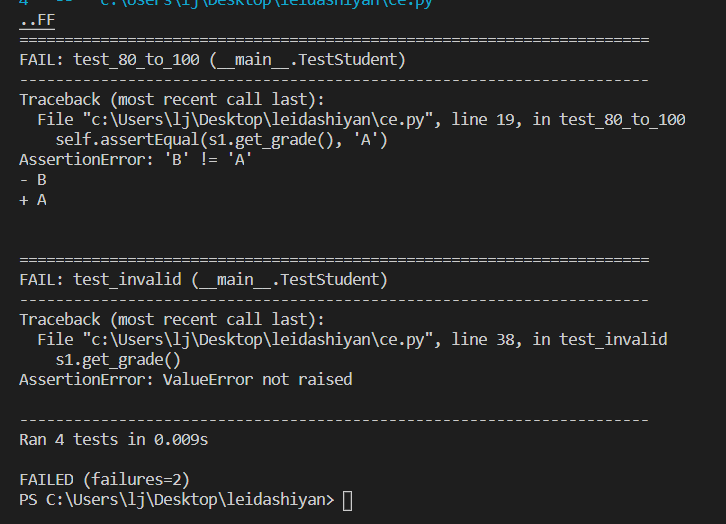 可以看到测试有2处错误,第一处在line 19处,使用get_grade方法时断言错误。回头查看,发现get_grade方法定义时不准确,应该先判断≥80,再判断≥60.第二处错误在line 38,使用get_grade方法输入的grade没有限制范围。回头添加限制条件,使 0≥grade≥100时,方法正确调用,否则raise 一个 ValueError