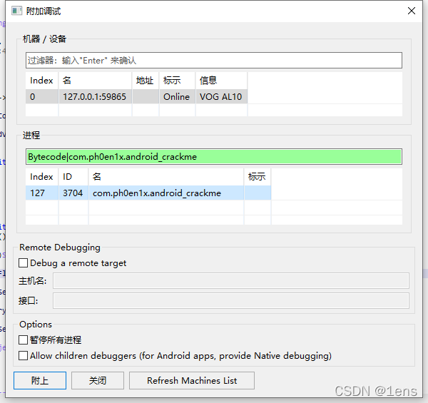 此时即可返回 JEB 在调试器工具栏选项中选择“开始”,将目标进程进行“附上”: