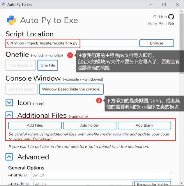 使用auto-py-to-exe即可,在我之前的文章中也有讲过,这里需要注意的是加密打包时,只需要选择主程序registerMA.py即可,其他的自定义模块如registerGUI.py是不用额外添加的,额外加入文件加入的是图片以及其他调用的exe等资源。并且我们还要选择Advanced中的key部分输入秘钥对文件加密,防止被反编译。