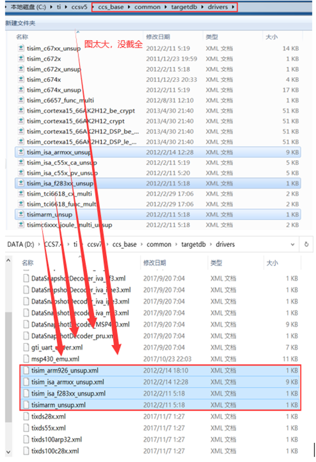 :将ccs仿真文件 \drivers文件夹中的四个文件 —复制到—XXX\ccs_base\common\targetdb\drivers文件夹下。(因为我使用的是TMS320F28335所以选择了下面四个文件便可以满足,如果不清楚要使用的芯片型号,将ti……开头的xml文件全部复制到XXX\ccs_base\common\targetdb\drivers文件夹下)