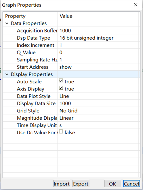 进入后进行如下设置(包含了数据属性和显示属性设置,注意数据属性里设置对数据的缓冲区的起始地址,具体可对照程序进行了解):
