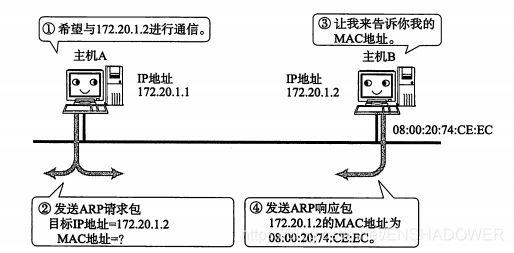 :从一个IP地址发送ARP请求包以了解其MAC地址,目标地址将自己的MAC地址填入其中的ARP响应包返回到IP地址,由此可以