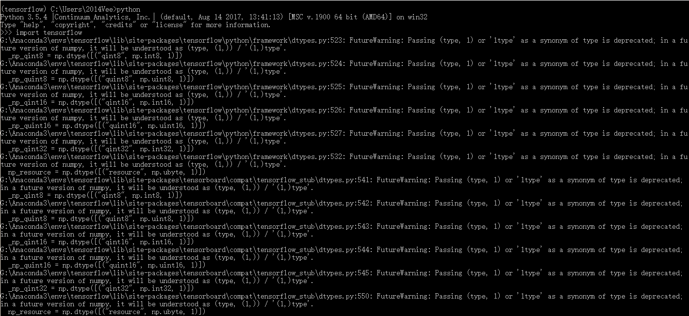 安装完成后就直接在tensorflow环境中的python里import tensorflow中测试是否可以import。