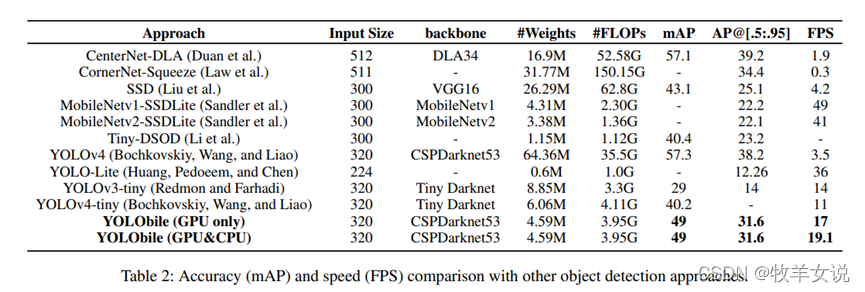 YOLObile,顾名思义,是一种适用于移动设备的轻量级网络,从压缩、编译两个角度,在保证模型准确率的基础上,减少模型的大小,并提升模型在移动设备端的运行速度。新的YOLObile framework将YOLOv4压缩了14倍,准确率保持在49.0mAP。