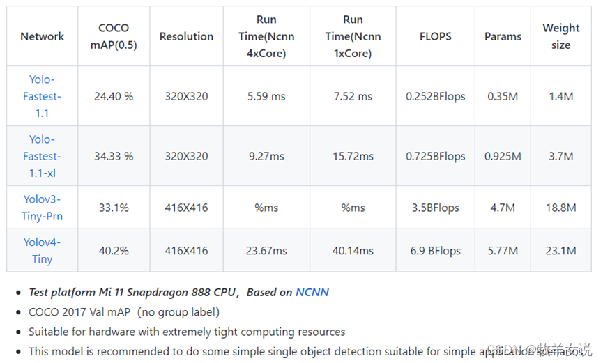 - 更高的mAP,参数量在1M以内,在输入像素416×416时,mAP超过30;