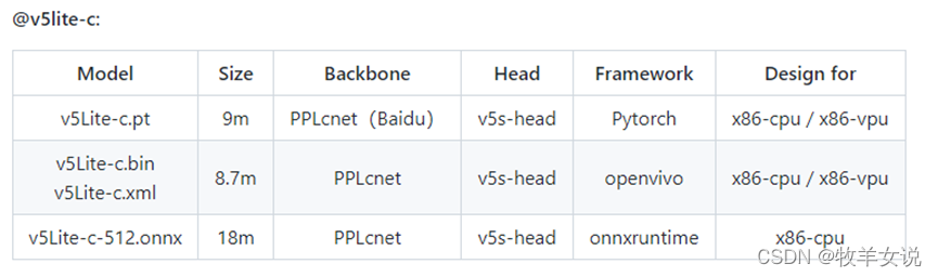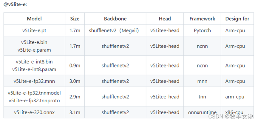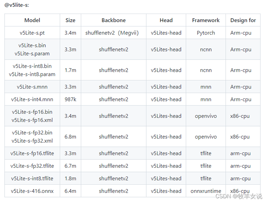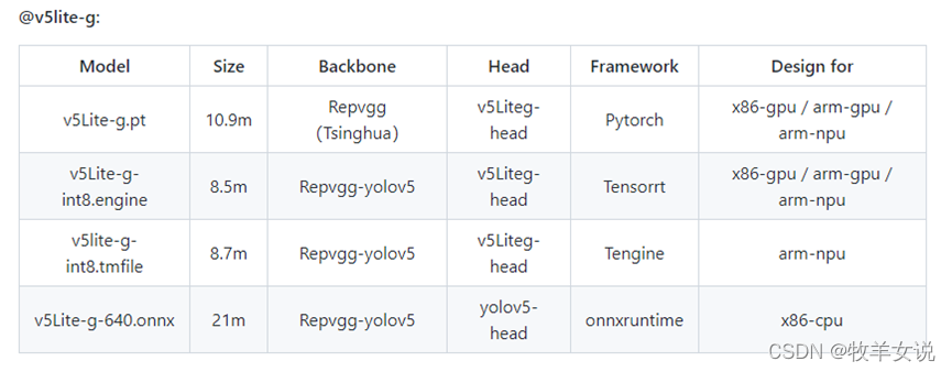 YOLOv5-Lite为轻量型的YOLOv5改进版本,整体算法与YOLOv5基本一致,通过修改了YOLOv5的backbone达到模型压缩的目的。根据不同的backbone分别提供了e、s、c、g版本,e版本的backbone为shufflenetv2,s版本的backbone也是shufflenetv2 (与e版本的head不同),c版本的backbone为PPLcnet,g版本的backbone为Repvgg。