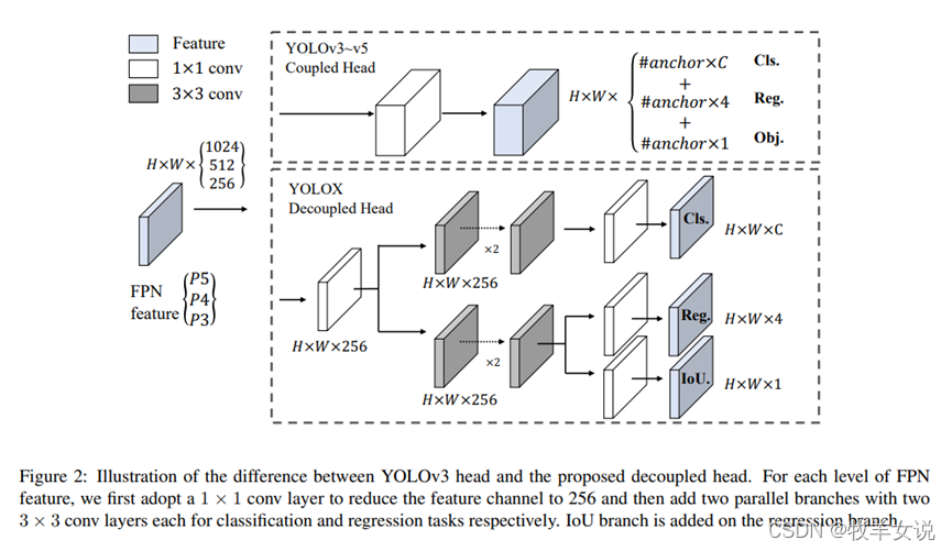 下图给出了YOLO和YOLOX在检测头结构上的区别: