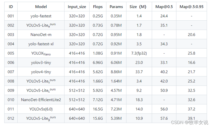 与各个轻量级算法的精度对比: