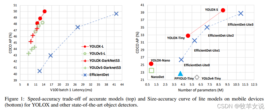 YOLOX是在YOLO系列的基础上进行了若干改进生成的新的高性能检测器。要点包括:(1) Anchor-free的检测方式;(2) 检测头解耦;(3) 先进的标签分配策略SimOTA;(4)强数据增广;(5) Multi positives。其中,YOLOX-Nano只有0.91M的参数量和1.08G FLOPs,在COCO数据集上获得了25.3%的mAP,比NanoDet高1.8% mAP。