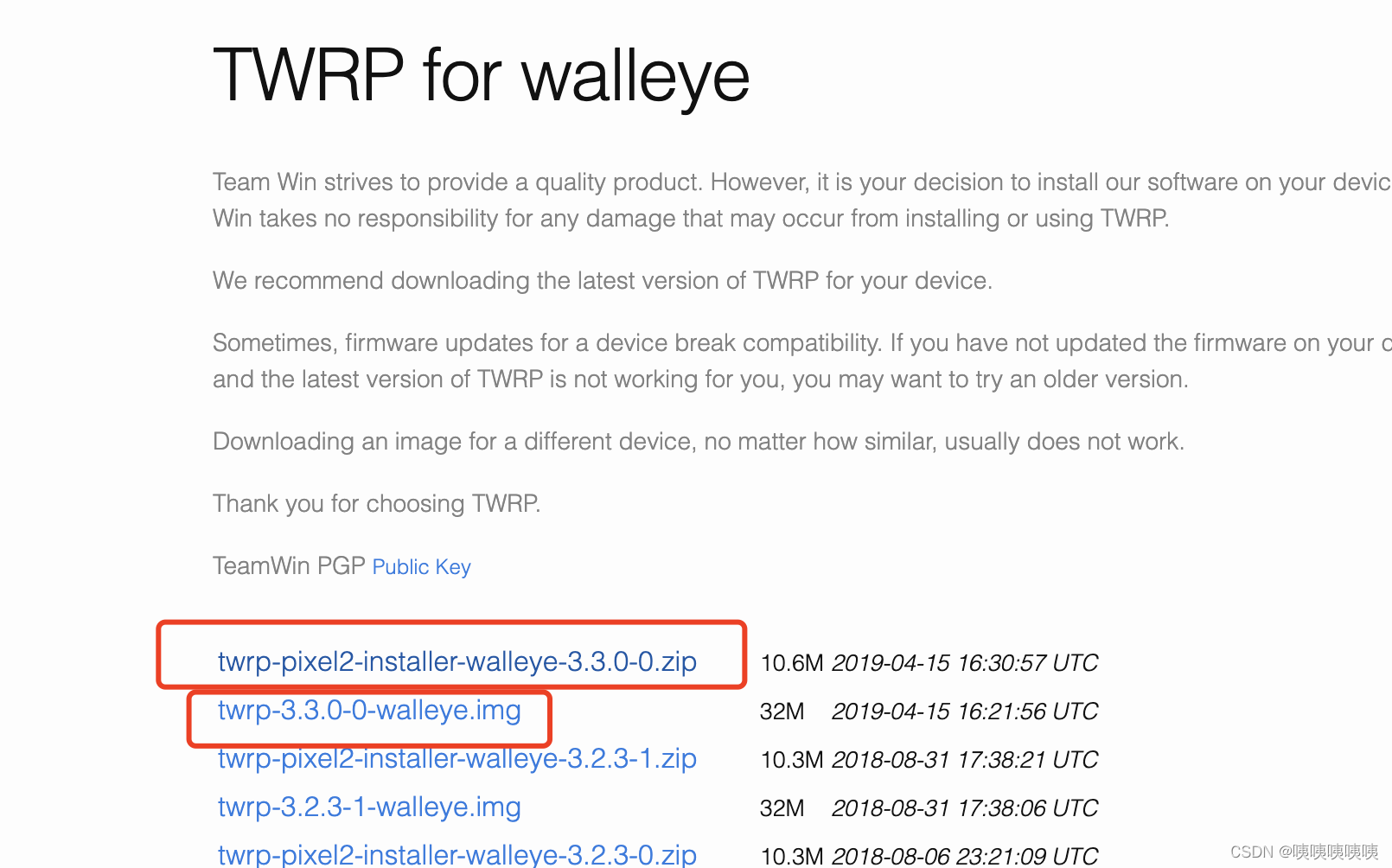 ,根据设备下载对应的zip和img文件,进入https://twrp.me/Devices/,搜索对应设备如 Pixel 2,选择 Google Pixel 2 (walleye)