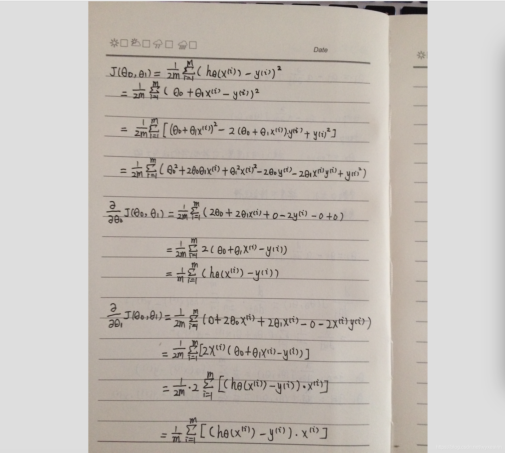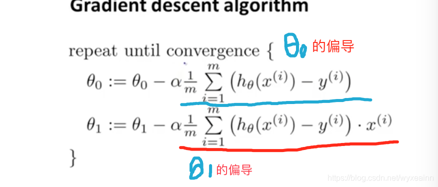 从一个(θ0,θ1)到一个新的点,需要求偏导数,课程中直接给出θ0和θ1的偏导。