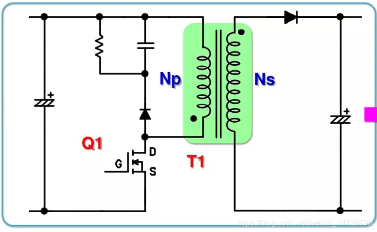 更低的导通电阻,直接表现为导电时的发热量。导通电阻越低,发热量越低。如下图为典型的手机充电器反激变换器拓扑,Q1即为开关管。