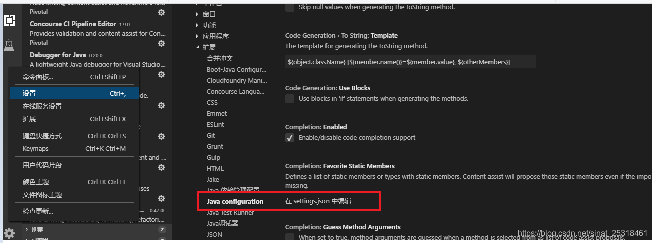 配置JAVA_HOME。打开settings.json,加入以下配置: