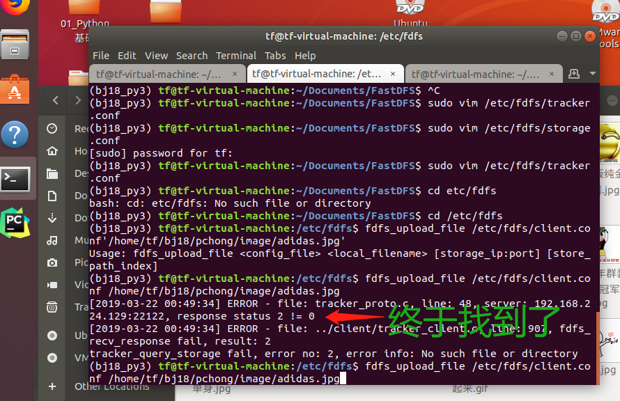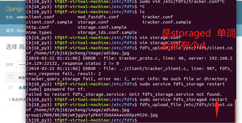在etc/fdfs 目录下执行 sudo service fdfs_storaged restart