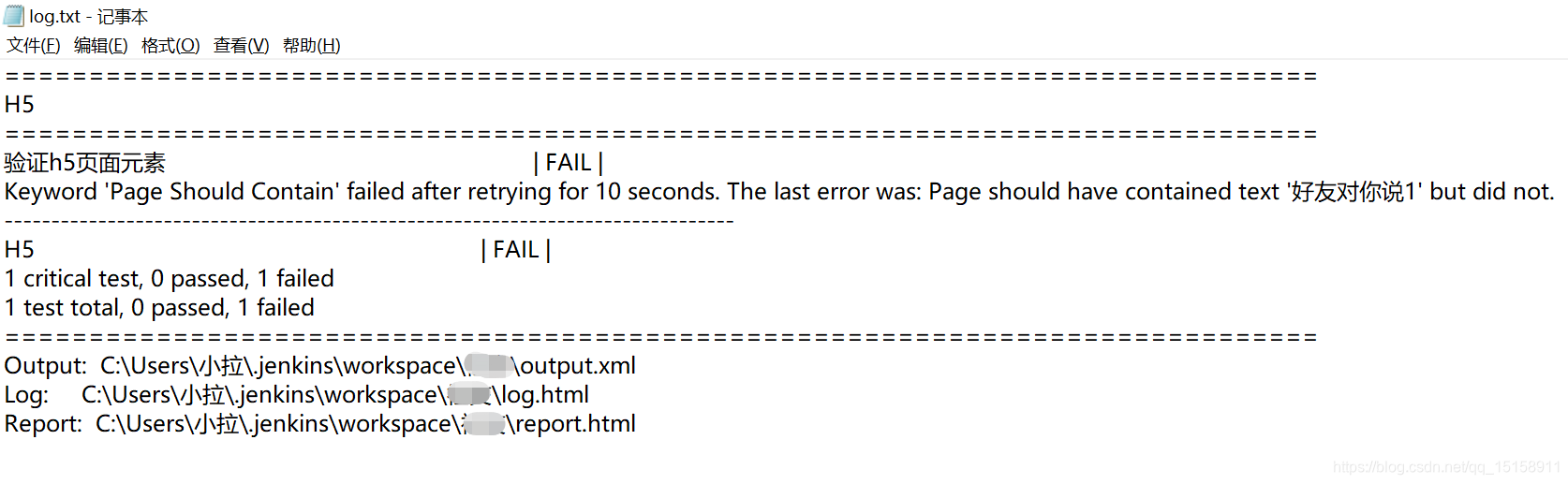 3.本次使用的是robot框架,测试用例运行完成后控制台输出的日志导出到log.txt文件如下