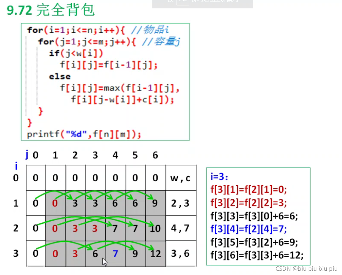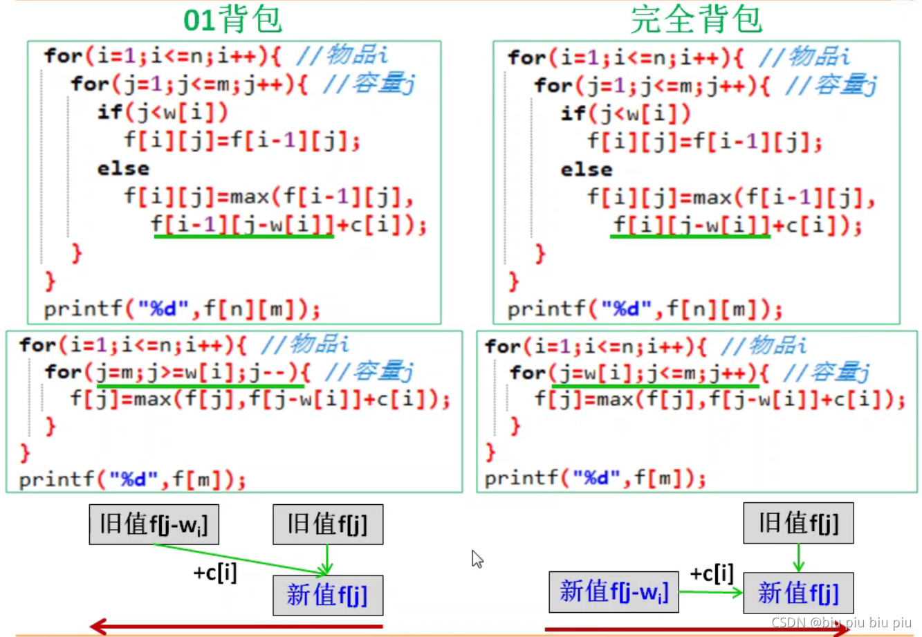 0-1背包我们计算当前行时,是通过上一行转移来的,完全背包因为可以放入多件当前物品,所以当前状态是从上一行和当前行转移来的。
