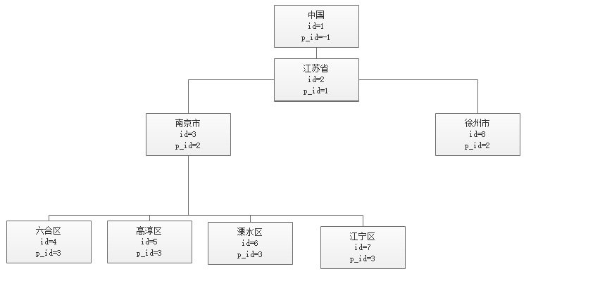 现在定一个目标,查询南京市,及所有他的附属区域(即子节点)。