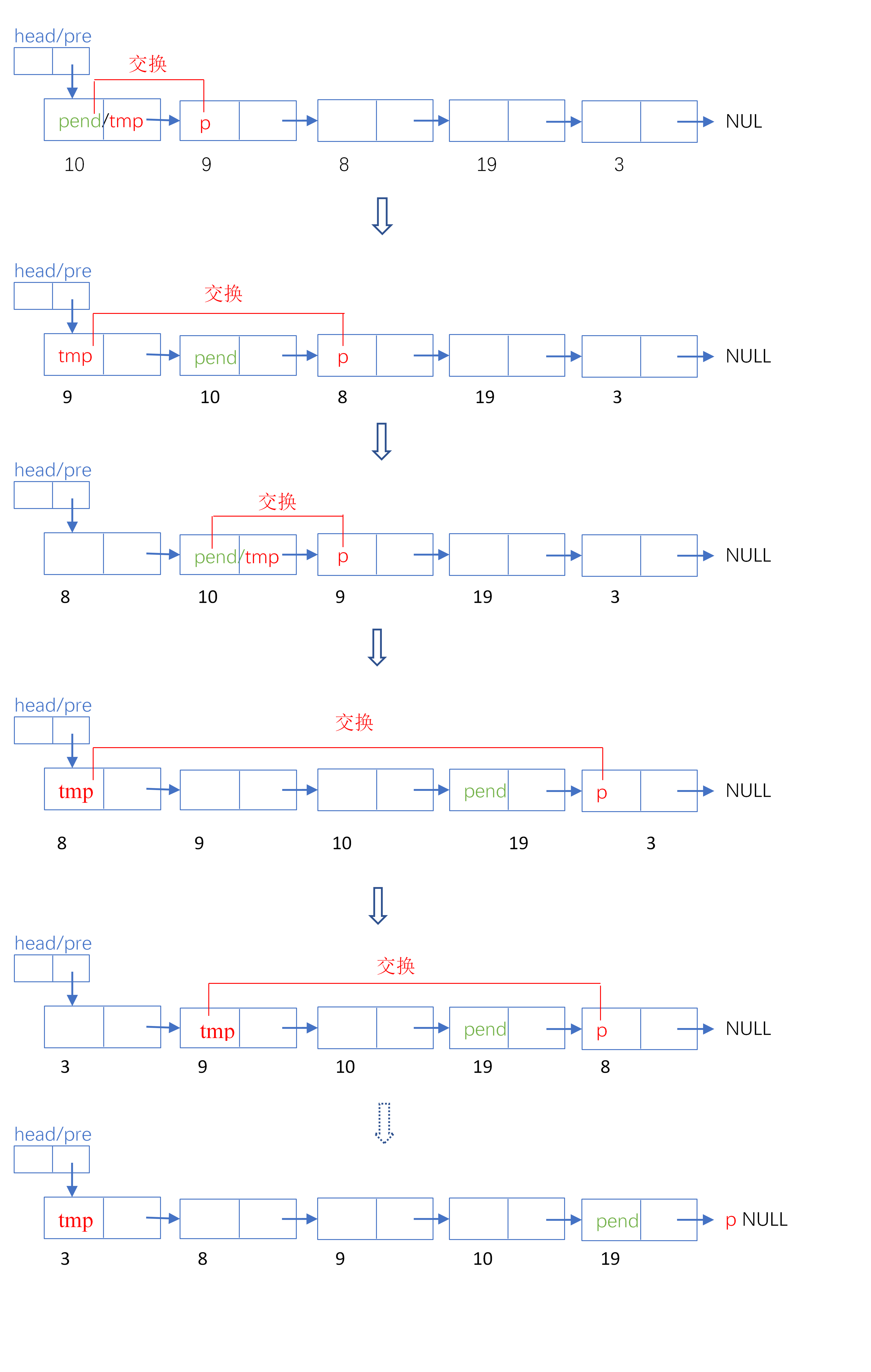 当tmp->val > p->val时,将tmp与p两结点交换;