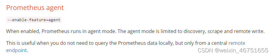 在prometheus开启agent模式时,prometheus.yml中必须配置“remote_write”,不能配置alertmanager和rules,因为agent节点仅有采集指标功能,添加alertmanager和rules启动时会报错!!!!