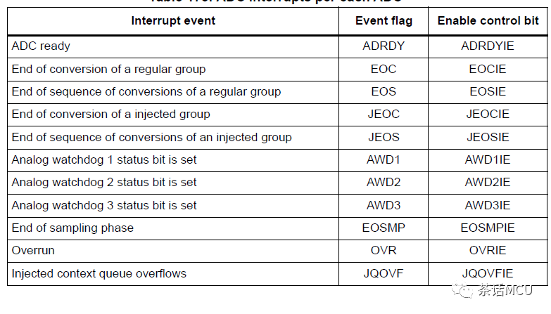 而ST的外设申请中断时就没有SYSTICK那么好的福分了。往往是一个外设的多个事件共用1个中断请求。比方以上面STM32G4系列ADC3的中断来看,因为它只有1个中断申请号,在CPU看来就一个中断入口,即所有ADC3相关事件触发的中断共用一个中断服务程序入口,但可以申请中断的事件可多了,见下图【我后面把能触发同一中断请求的事件称之为兄弟事件】: