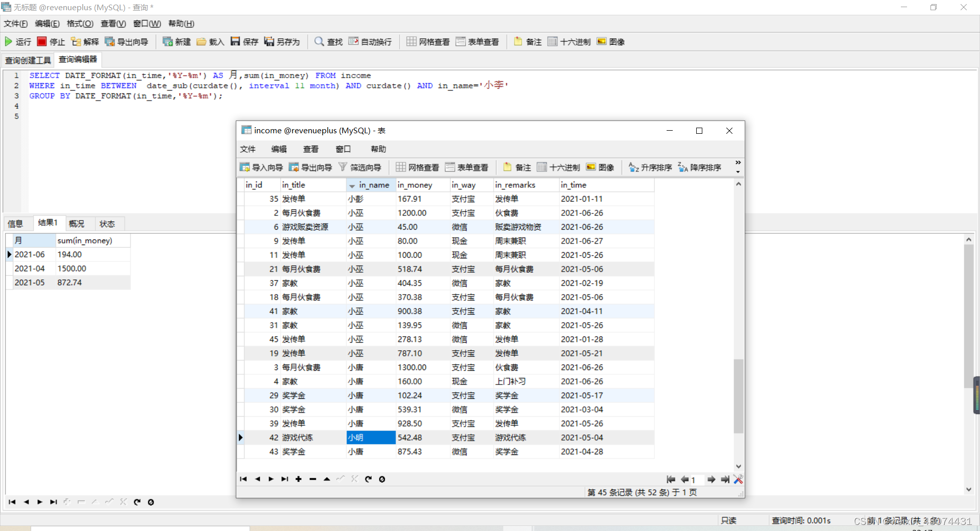 SELECT DATE_FORMAT(in_time,’%Y-%m’) as 月,sum(in_money) FROM income