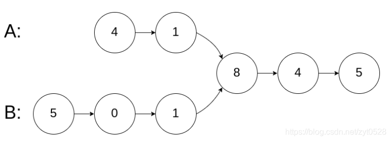 输入解释:相交节点的值为 8 (注意,如果两个链表相交则不能为 0)。从各自的表头开始算起,链表 A 为 [4,1,8,4,5],链表 B 为 [5,0,1,8,4,5]。在 A 中,相交节点前有 2 个节点;在 B 中,相交节点前有 3 个节点。