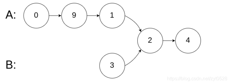 输入解释:相交节点的值为 2 (注意,如果两个链表相交则不能为 0)。从各自的表头开始算起,链表 A 为 [0,9,1,2,4],链表 B 为 [3,2,4]。在 A 中,相交节点前有 3 个节点;在 B 中,相交节点前有 1 个节点。