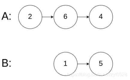 输入解释:从各自的表头开始算起,链表 A 为 [2,6,4],链表 B 为 [1,5]。由于这两个链表不相交,所以 intersectVal 必须为 0,而 skipA 和 skipB 可以是任意值。