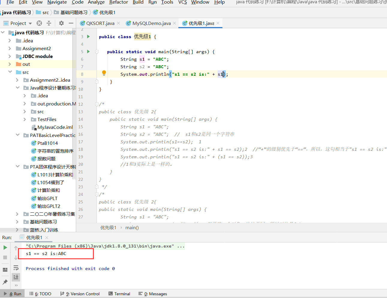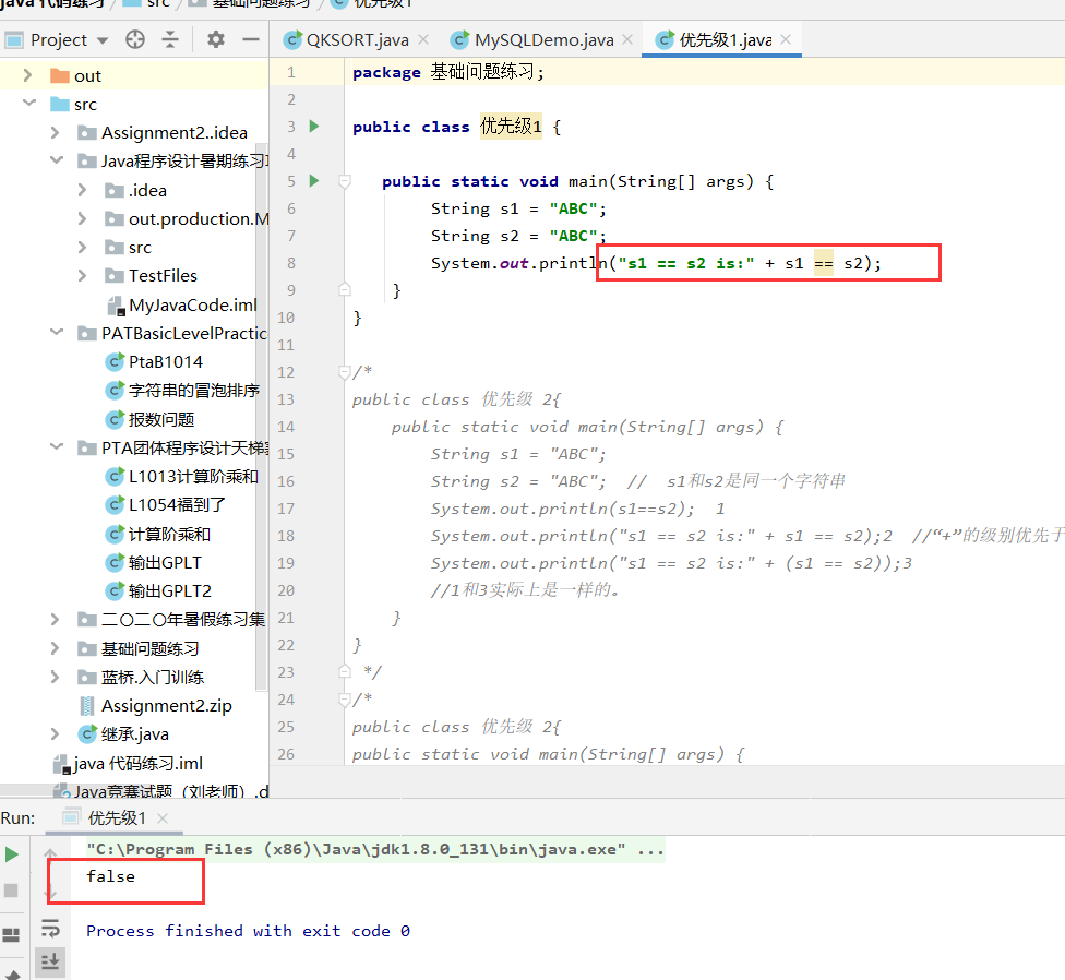 System.out.println("s1 == s2 is:" + s1 == s2); // 语句2 中“+”的级别优先于“==”,所以,这句相当于"s1 == s2 is:" == s2,即判断"s1 == s2 is:ABC"=="ABC",结果为false。