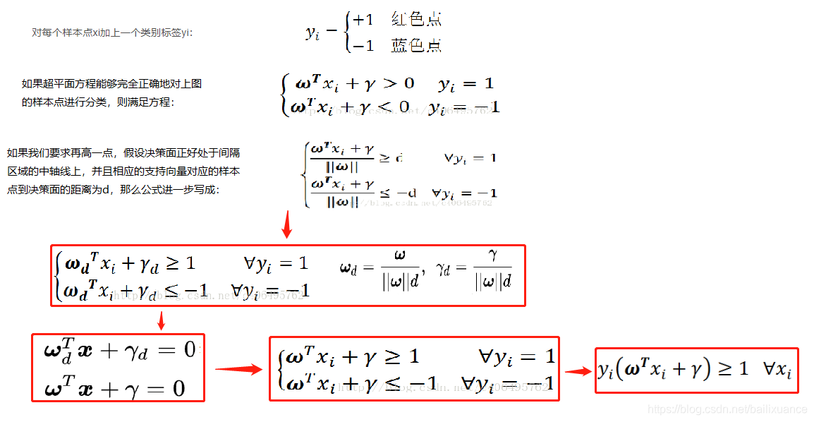 所以要对SVM问题进行数学建模,首先要对上述两个对象(”分类间隔”和”决策面”)进行数学描述。按照一般的思维习惯,我们先描述决策面。
